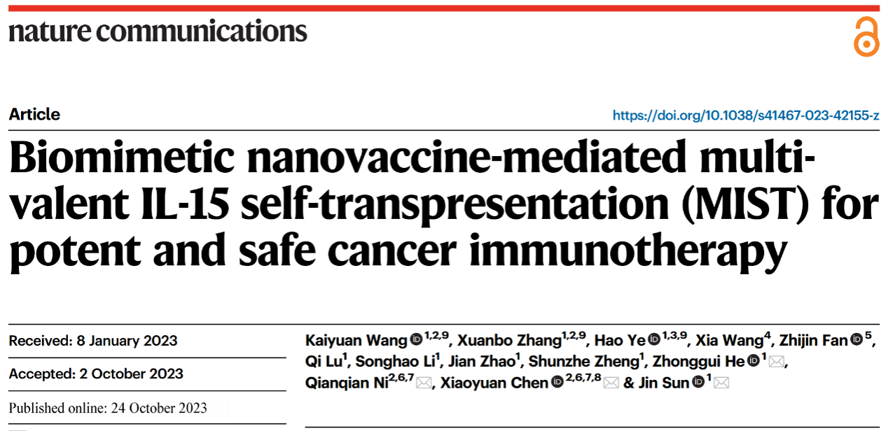 2023年10月24日,beats365唯一官方网站孙进教授、何仲贵教授与新加坡国立大学陈小元教授、倪倩倩助理教授合作在Nature Communications杂志在线发表题为“Biomimetic nanovaccine-mediated multivalent IL-15 self-transpresentation (MIST) for potent and safe cancer immunotherapy”的研究论文,开发了仿生纳米疫苗介导多价IL-15自反式呈递,实现了IL-15和肿瘤抗原的时空同步递送,从而有效产生肿瘤特异性细胞毒性T淋巴细胞,用于有效且安全的肿瘤免疫治疗。