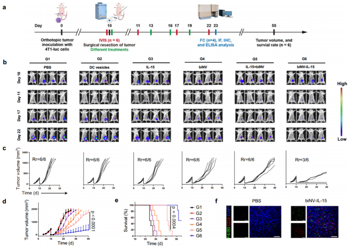 图5. biNV-IL-15抑制肿瘤术后复发