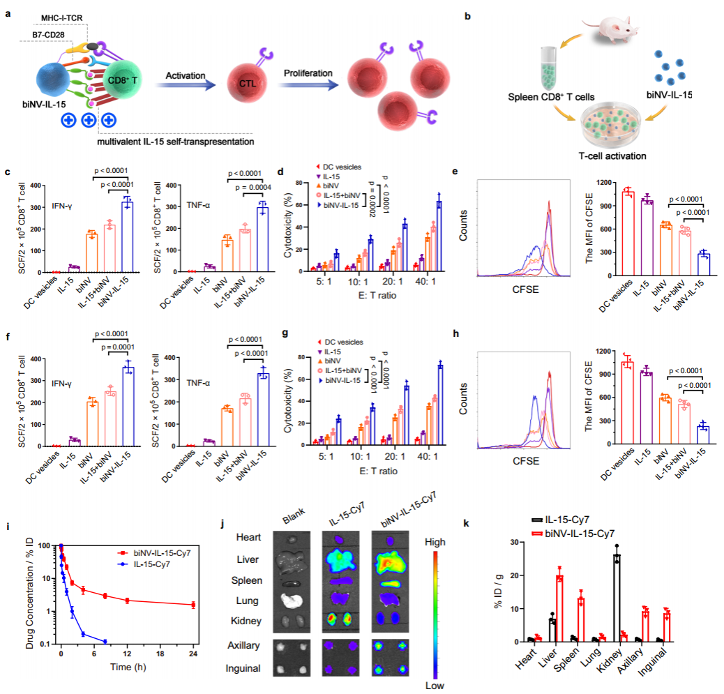 作者接着在体外验证了biNV-IL-15可有效引起初始CD8+T细胞的激活。要想在体内实现IL-15的自反式呈递依赖于制剂向淋巴器官的有效递送。然而,快速的全身清除和不足的次级淋巴器官保留仍然是IL-15临床应用的重要障碍。体内研究表明biNV-IL-15显示出延长的循环时间,t1/2约为5.66小时。给予biNV-IL-15的小鼠的腋窝和腹股沟淋巴结比给予IL-15的小鼠表现出高得多的药物蓄积,而且biNV-IL-15能够有效递送至脾脏(图3)。