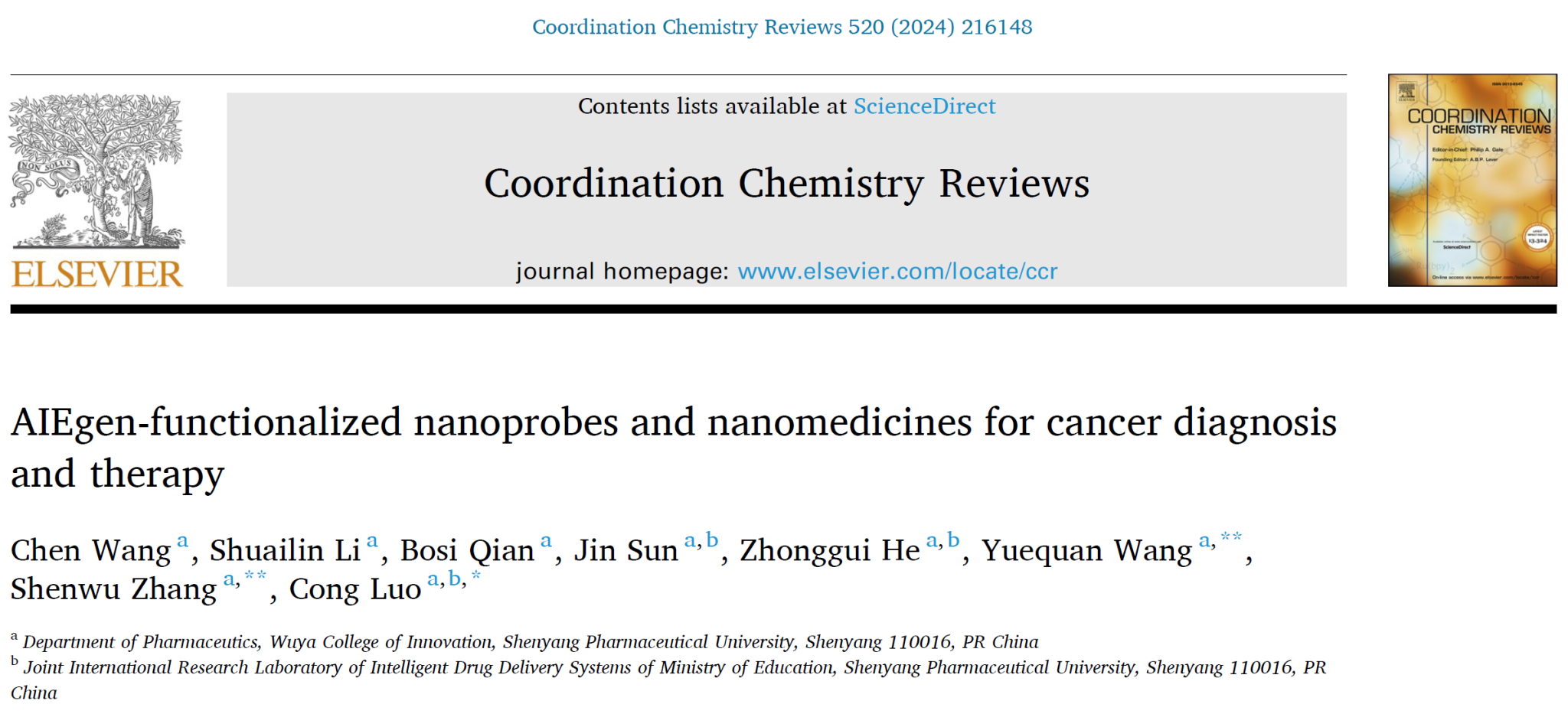 beats365唯一官方网站罗聪课题组在Coordination Chemistry Reviews发表AIE纳米探针和纳米药物综述文章